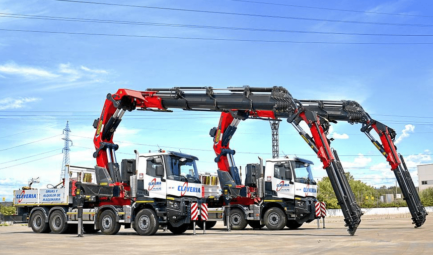 Enfin, pour finir, deux autres Renault, en 8×4 cette fois, dans une belle posture, flèche déployée vers l’avant. Ceux-ci sont espagnols et leurs grues Palfinger sont des 165 t.m. Déjà du gros matos