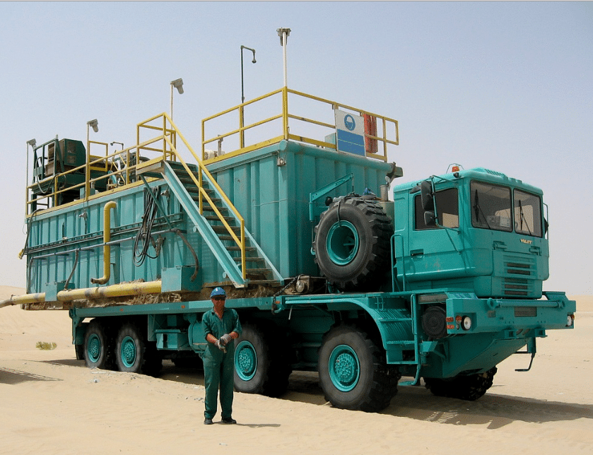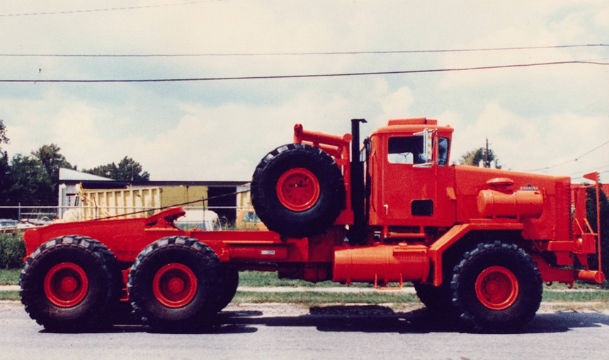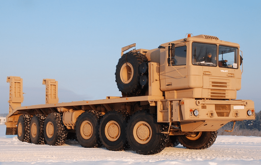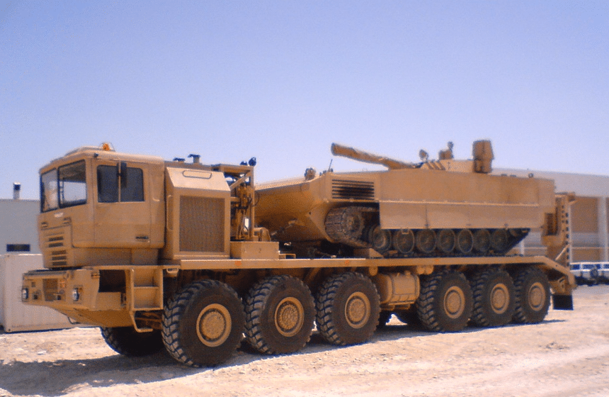 De ce châssis, différentes versions militaires ont aussi été dérivées, comme ce porte-chars 12×12 de 55 t de charge utile (doté de 6 essieux de 16 t), développé pour une armée du Moyen-Orient et entraîné par un V8 Deutz de 720 ch suivi d’une boîte Allison. Il est aussi doté d’une suspension hydropneumatique à roues indépendantes, beaucoup plus sophistiquée que celle du modèle pétrolier, qui lui permet notamment de circuler jusqu’à une vitesse de 75 km/h. À noter que le dernier essieu est aussi directeur, ce qui autorise un rayon de braquage de 17 m malgré une longueur 14,8 m et la présence (encombrante) de 6 essieux moteurs.