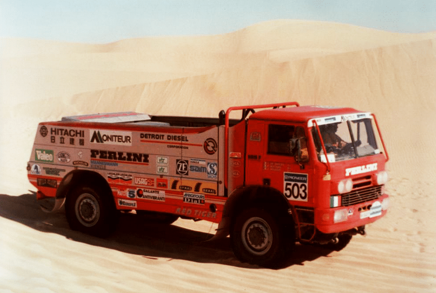 Enfin, ci-dessous, un petit souvenir des grandes heures sportives de Perlini qui, de 1988 à 1994, a engagé dans le Paris-Dakar ce camion de type 105F, surnommé Red Tiger. Un 4x4x4 (4 roues motodirectrices) de 600 ch (moteur Detroit Diesel), dérivé d’un châssis d’intervention pour aéroport. Non sans succès d’ailleurs puisqu’il a remporté quatre victoires consécutives dans sa catégorie entre 1990 et 1993.