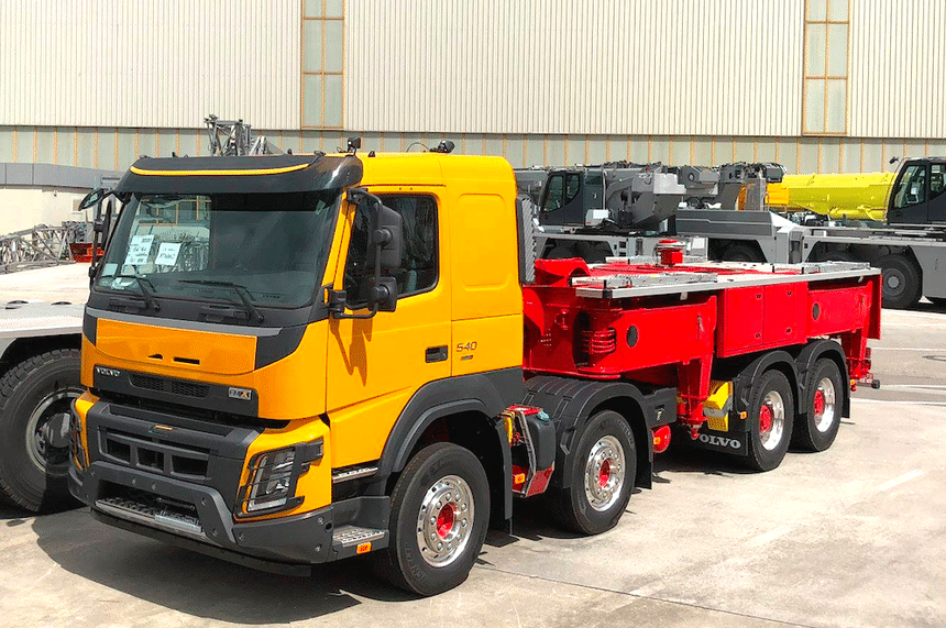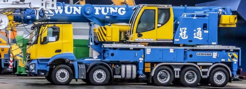 Si la réglementation l’exige, des porteurs à 5 essieux peuvent aussi être choisis, comme pour cette LTF, destinée à un levageur de Hong Kong, montée sur un Mercedes Arocs 10×4 (photo Hadel.net).