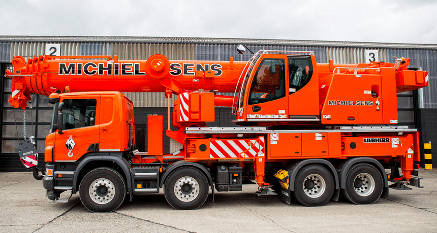 Liebherr monte aussi cette grue sur d’autres porteurs, principalement Scania, comme ici une machine du levageur belge Michielsens.