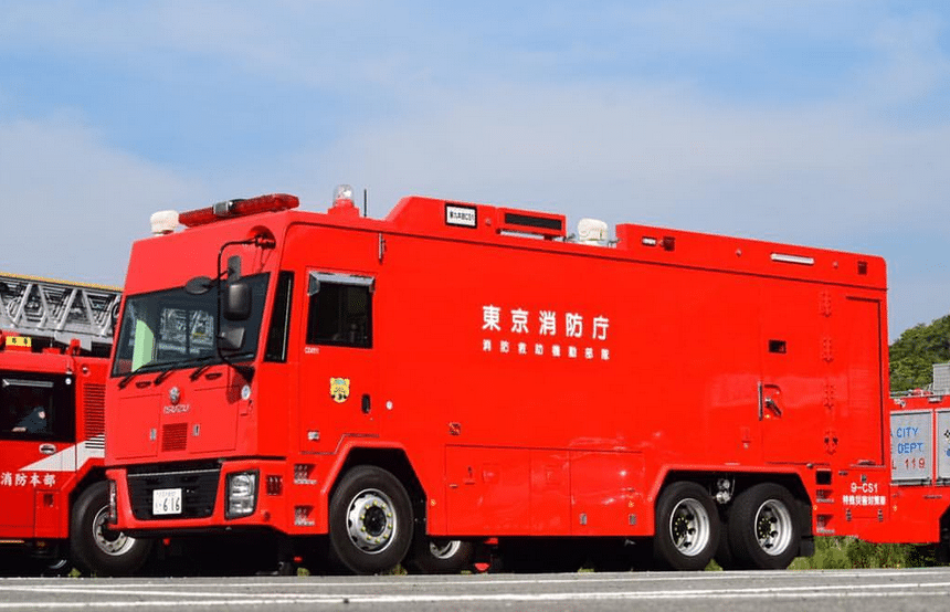 Outre la police nationale, les pompiers de plusieurs grandes villes disposent aussi de camions d’intervention classés NBC. Comme celui-ci, réalisé sur un châssis Isuzu 6×4, qui appartient aux pompiers de Tokyo.