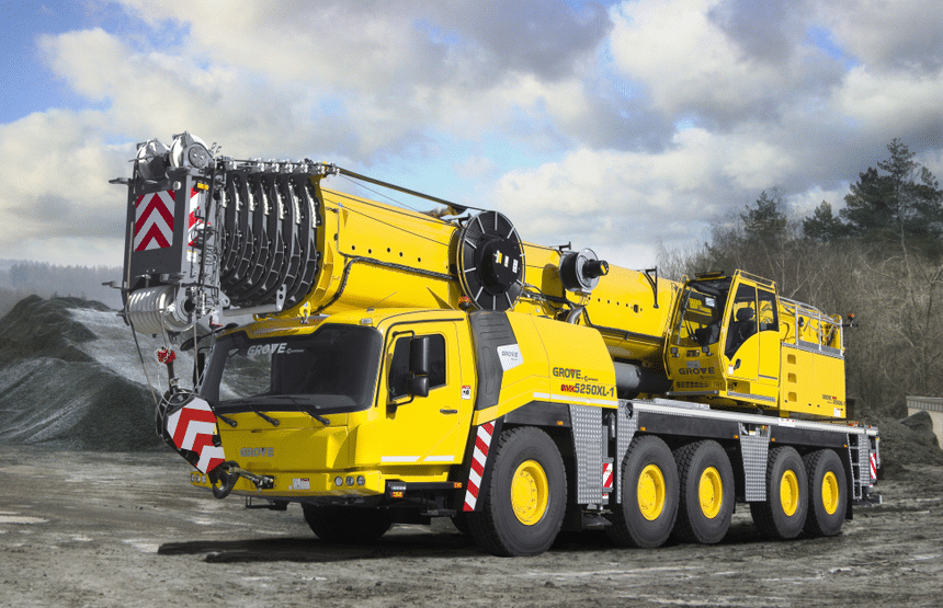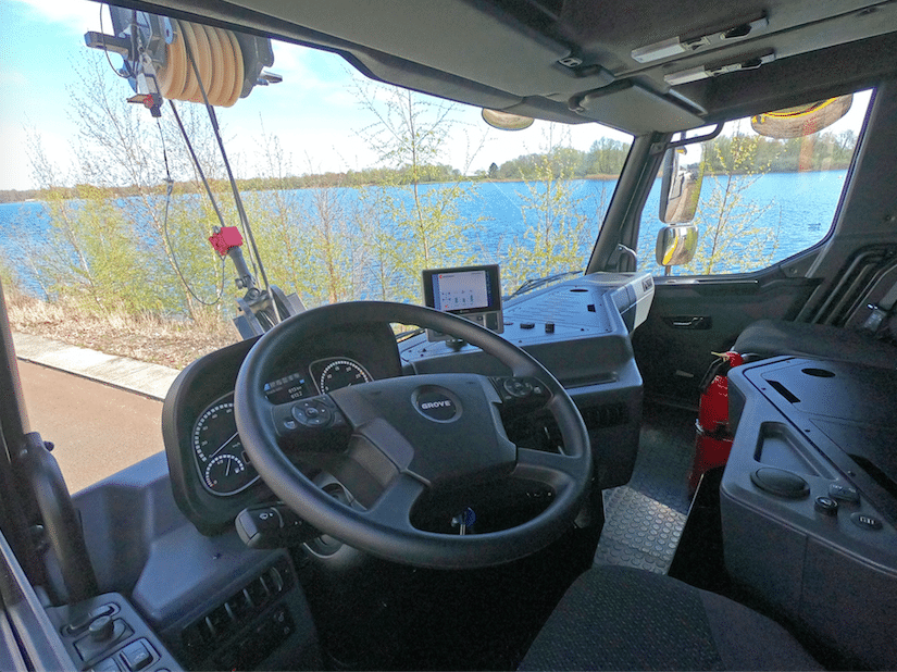 Évidemment, et ça saute aux yeux, cette cabine n’est pas celle d’un camion tout à fait comme les autres. Et pour cause, il s’agit d’un porte-grue. En l’occurrence de la nouvelle génération de grues mobiles télescopiques Grove de la série GMK à 4 et 5 essieux (jusqu’à 150 t de capacité de levage).