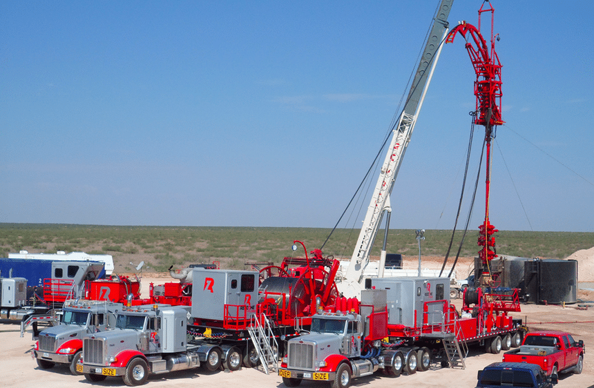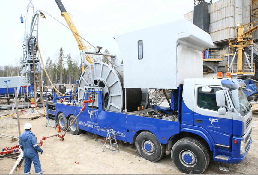 Une bobine disions-nous. C’est presque le cas. Ce camion, dont on voit ici un autre exemple, comparable au premier, est ce qu’on appelle un Coiled Tubing Rig. Ce qui ne vous éclairera pas d’avantage, à moins d’être un familier des forages pétroliers. Car c’est pour l’industrie pétrolière qu’a été conçu cet ensemble qu’on pourrait qualifier en français d’unité de tubage enroulé (ou tube d’intervention enroulé).