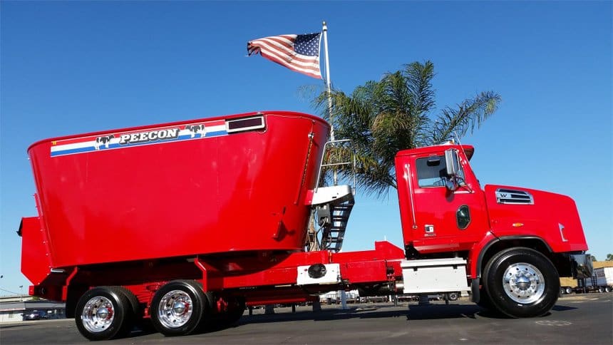 Rouge pétant, finition éclatante, ce Western Star 4700SB ne passe pas inaperçu qui est sur le point d’être livré. Ou de partir s’exposer sur un salon spécialisé, ce qui ne serait pas impossible vu le soin apporté à sa présentation. Bref, il vient d’être carrossé et c’est bien ce qui nous intrigue : cette espèce de grand chaudron qu’on lui a greffé n’évoque rien de connu pour nous. La scène se passe aux Etats-Unis, aucun doute là-dessus, et depuis le temps que l’on vous montre des camions américains (de toutes sortes) dans France Routes, je n’ai pas le souvenir qu’un tel ensemble ait jamais été photographié et publié.