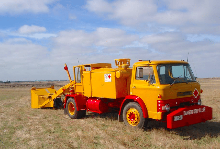 Le modèle nous renseigne en revanche sur l’époque. Il s’agit d’un Ford série D, camion qui fut parmi les plus populaires de sa génération. Conçu au Royaume-Uni et fabriqué de 1965 à 1981 (remplacé par le Ford Cargo)), il sera largement exporté dans le monde, y compris en France. Celui-ci, avec sa conduite à droite et son inscription en anglais sur le pare-chocs (pas d’origine d’ailleurs, et pourquoi ?) n’était manifestement pas en service chez nous. Mais où ? Et surtout, pour quoi faire ?