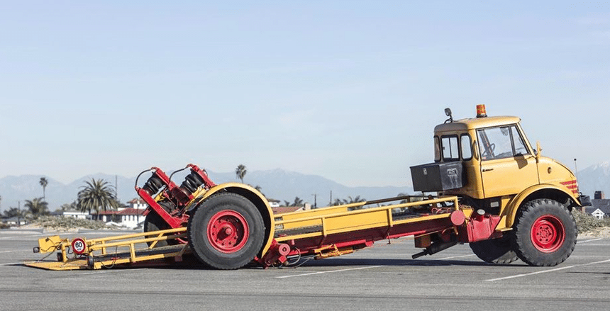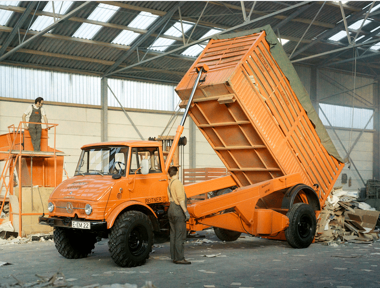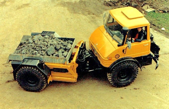 De ce point de vue, l’image d’ouverture n’est pas représentative de l’usage courant d’un Unimog en « tête motrice », puisque, dans ce cas, la superstructure, une benne déposable, est montée devant la partie motrice, avec une direction articulée entre les deux éléments. Spectaculaire tout de même.