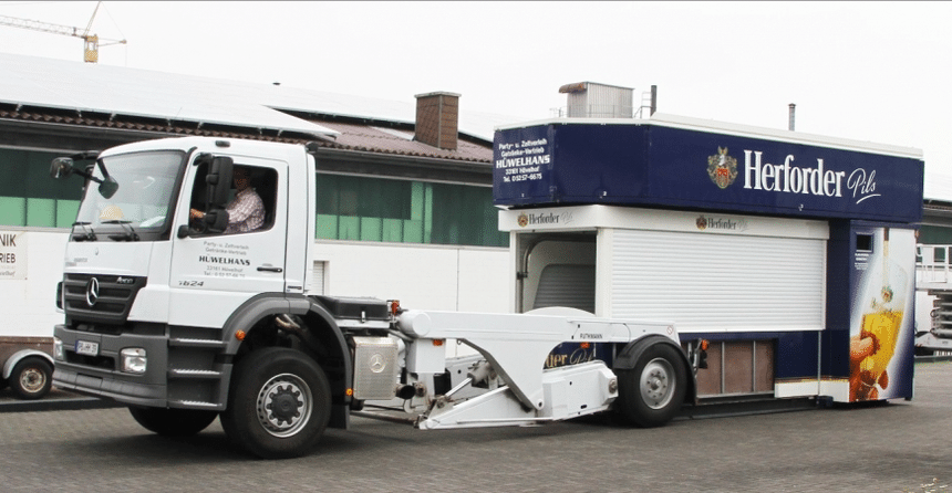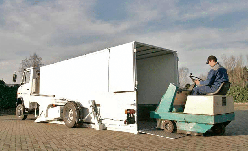 Plus classiquement, voici quelques exemples d’Unimog carrossés par Ruthmann. Le premier montre un plateau pouvant être posé au sol, pour l’auto-chargement/déchargement d’engins. Le second, une carrosserie dont la structure en forme de U, ouvert sur l’arrière, permet l’échange de carrosseries, leur mise à niveau au sol ou en hauteur, voire leur bennage.