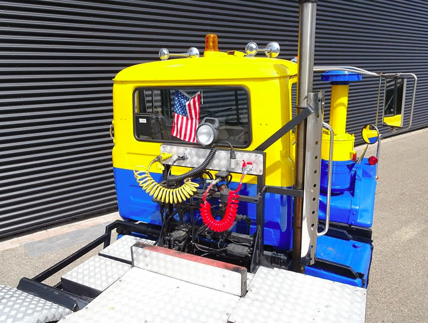 On notera que la cabine, assez étroite, est déportée sur la gauche, côté conducteur, afin d’améliorer visibilité. Mais un positionnement centré classique était aussi proposé.