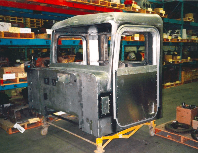 La cabine est peinte et installée. Elle est de type off-set, c’est-à-dire légèrement décalée sur la gauche, pour donner une meilleure visibilité au conducteur.