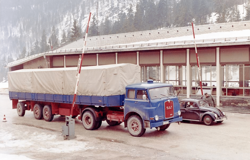 En 1966, ce MAN 13.212 FS passe un poste de douane entre l’Allemagne et la Suisse, ou l’Autriche. Sa semi-remorque tridem à monte simple est conforme à la nouvelle réglementation allemande qui autorise, depuis un an, un PTRA de 38 t pour les ensembles totalisant 5 essieux. Avec toujours une limite de 10 t par essieu. La configuration de la semi n’est toutefois pas classique avec un dernier essieu très reculé et auto-vireur. En France, on roulait alors à 35 t sur 4 essieux, avec une charge maxi de 13 t à l’essieu. Le 6 cylindres en ligne du MAN n’affichait que 212 ch mais cette puissance, mesurée selon la norme DIN, équivalait largement aux 225 ch SAE du moteur Unic.