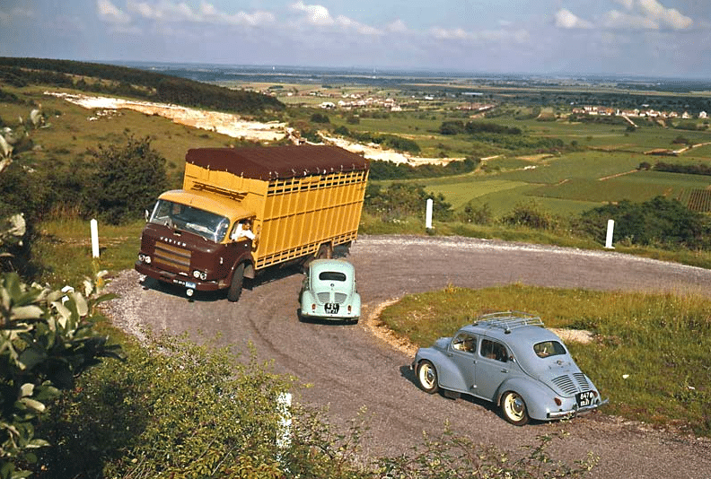 Retour en France avec un Saviem JL 29 croisant, en 1963, deux 4 CV sur une route pas facile mais pittoresque. Saviem entretient alors depuis deux ans une étroite collaboration avec l’Allemand Henschel qui lui fournit les moteurs nécessaires à sa gamme lourde. Des échanges ambitieux, techniques et commerciaux, sont au programme, mais l’affaire capotera et en septembre 1963 c’est avec l’Anglais Rootes (et sa marque Commer) que les patrons d’Henschel décideront de s’allier. Ils n’allaient pas gagner au change… Finalement, c’est auprès de MAN que Saviem trouvera un partenaire fiable et efficace.