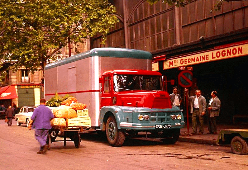 Un Unic Tourmalet stationne, après une longue route vers la capitale, devant un pavillon Baltard des Halles de Paris, à la fin des années 1950.