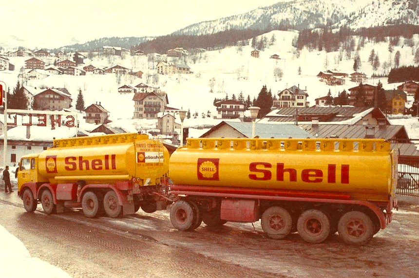 En Italie cette fois, au début des années 1970, un Fiat 690 N 1 approvisionne en carburant une station de sport d’hiver. Ce porteur-remorqueur 8×2 est alors le maxi-code le plus diffusé – et de loin – dans la péninsule. A cette époque, les camions italiens sont sans doute les plus compliqués d’Europe : il faut 8 essieux pour atteindre le PTRA maximum de 44 t, avec une distribution complexe entre essieux à monte jumelée et essieux à monte simple, ces derniers étant toujours auto-vireurs et relevables sur les porteurs. Ce qui signifie aussi que les charges à l’essieu étaient extrêmement faibles. Ainsi, le PTAC maximum d’un porteur 8×2 n’excédait pas 22 t. Valeur correspondant à limite des 6×2 en Allemagne. Sans parler de la France, qui autorisait 26 t aux 3 essieux.
