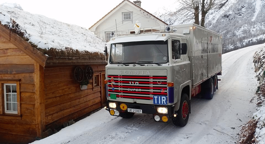 Ambiance hivernale pour ce Scania LBS 110 6×2 empruntant une minuscule route enneigée de Norvège, vers 1972. Ce camion fera une brillante carrière et l’on peut dire que c’est avec lui, et le LB 140 à moteur V8, que Scania va commencer à bâtir son image de marque haut de gamme.