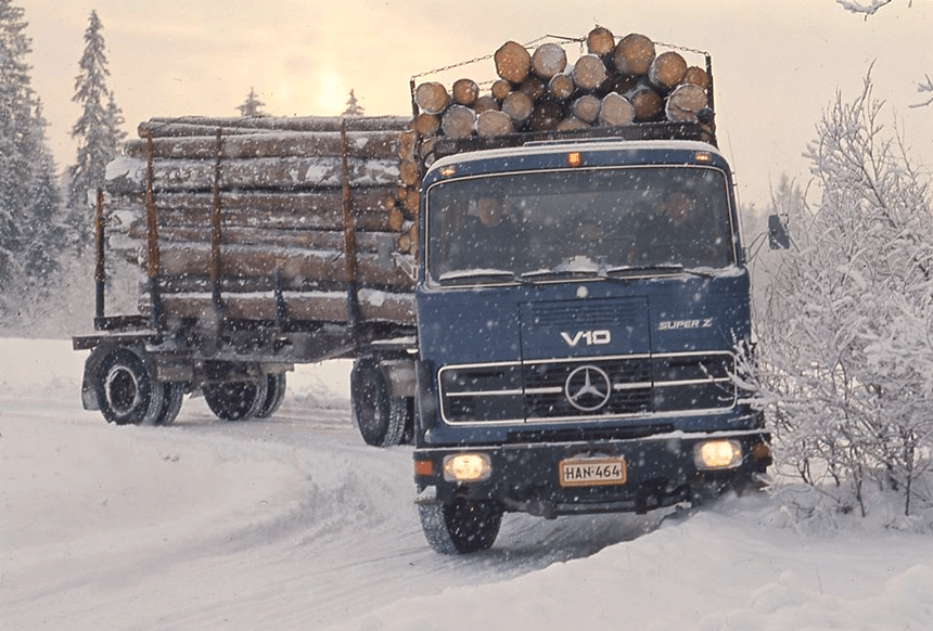 Plus au Nord, en Finlande, un Mercedes LP 2232 6×4 progresse prudemment sur une piste forestière copieusement enneigée. La scène se déroule en 1972. Ce modèle est alors le plus puissance de la marque, motorisé par un V10 de 320 ch. Valeur assez modeste au regard de la cylindrée, mais obtenue sans le renfort de la suralimentation. Procédé auquel Mercedes restera obstinément rétif durant de longues années. Avec son équivalent à moteur V8, il sera aussi le premier Mercedes à cabine basculable.
