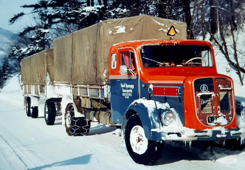 En souvenir de ces époques, voici donc, une série de photos montrant des camions confrontés aux conditions hivernales et neigeuses. Avec, en ouverture, un camion Berna surpris en 1949, en Suisse, entre deux belles murailles de neige.