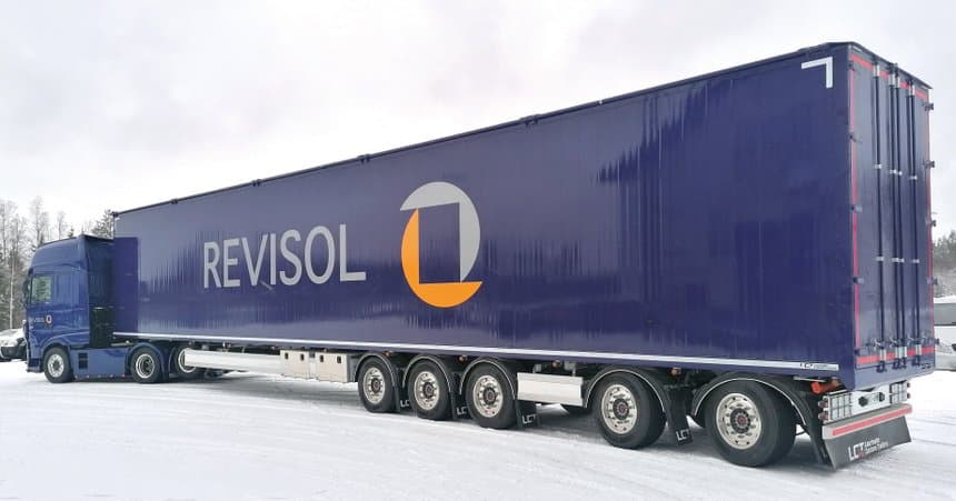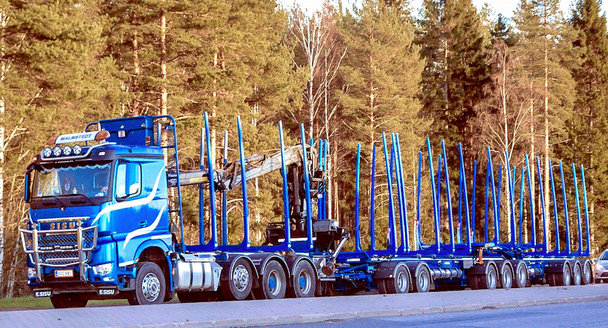Cet autre ensemble, encore expérimental, circule depuis 2018. Il se compose d’un porteur Sisu Polar 8×4 attelé à deux remorques, la seconde en mode B-train, c’est-à-dire sans dolly. Bilan, 12 essieux et 32 m de long pour un PTRA de 92 t. Moins que la longueur, qui reste en-dessous de la cote maximale prévue par la réglementation (34,5 m), c’est le poids qui fait ici l’objet d’une dérogation, car dépassant de 16 t le PTRA légal. Un projet taillé sur mesure pour l’industrie du bois