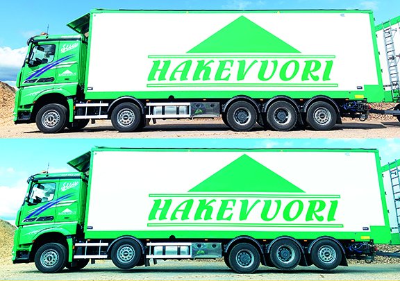 Enfin, que ceux qui pensaient que la semi citerne de 17,5 m (de la semaine dernière) constituait un record se ravisent : cette semi-remorque à fond mouvant affiche, quant à elle, une longueur de 19,3 m ! Réalisée par Laurisho-Yhtiöt, elle a une capacité de 160 m3. Attelée à un tracteur à 3 essieux, comme ici un Daf XF, elle permet de rouler à 64 t de PTRA, avec une charge utile de 41 t. Mais avec un tracteur à 4 essieux, il est possible de l’utiliser jusqu’à 69 t de PTRA.