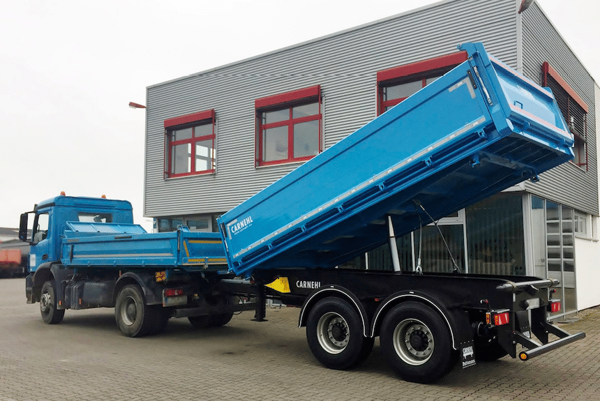 Mais revenons à notre benne du début. Il manque, sur la photo, un élément-clé pouvant expliquer son insolite système de basculement : le porteur avec lequel elle travaille normalement est équipé d’une grue derrière cabine de moyenne puissance dont la portée ne permet d’atteindre que la partie avant de la remorque. Pour saisir et décharger, à l’aide d’une benne preneuse, les matériaux restés à l’arrière, il a donc été prévu de faire basculer la caisse à contre-sens, afin de laisser glisser le sable ou la terre qu’elle contient vers l’avant, à portée de la grue. CQFD !