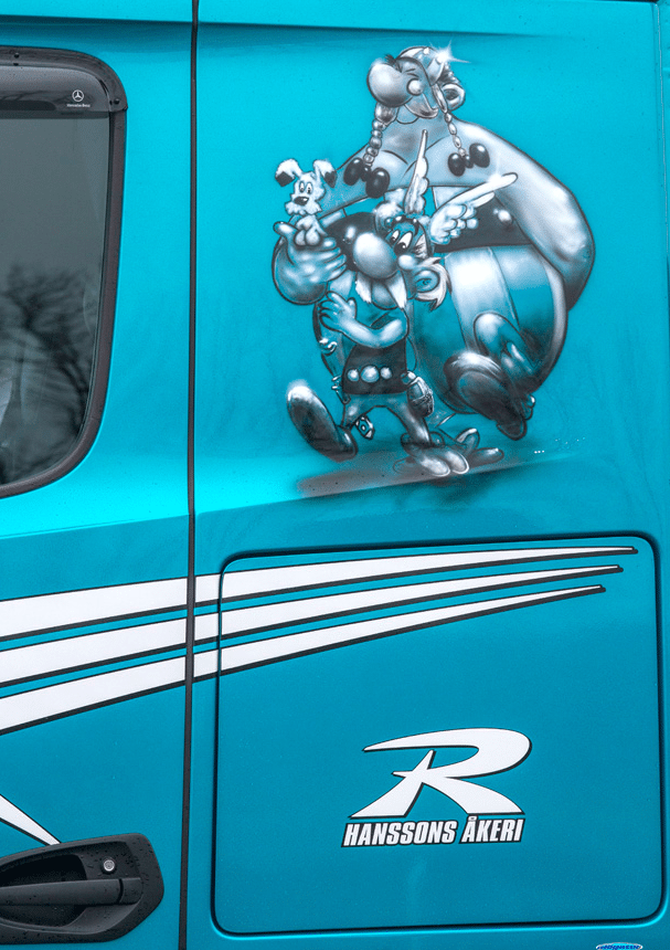 Ils sont Suédois, fans de Mercedes et… grands admirateurs d’Astérix. Aussi, ne soyez pas étonnés que les trois camions, superbement préparés, avec lesquels travaillent Robert Hansson, Rasmus Hansson, son fils, et Daniel Nilsson, soient tous des Mercedes et qu’ils arborent, sur les flancs de leur cabine, les effigies des principaux personnages de la célèbre bande dessinée.