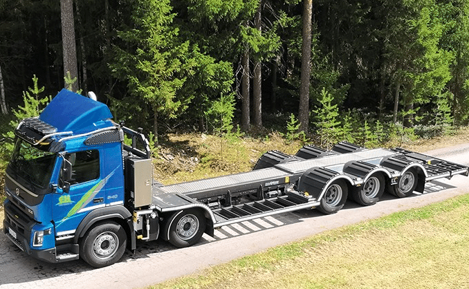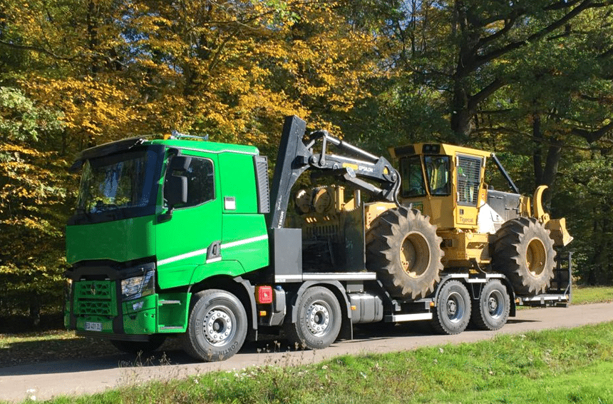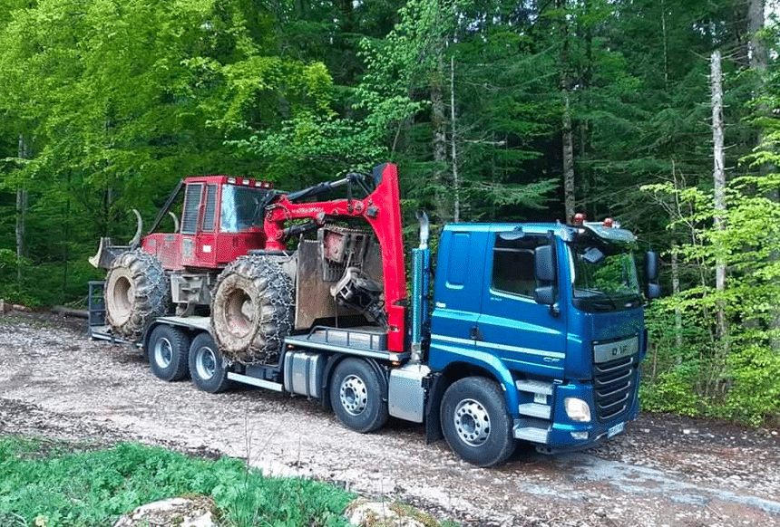 Nous les avons évoqués à propos des grandes longueurs en Finlande, avec notamment l’exemple d’un Sisu 10×4 de 13 m de long (cliquez sur ce lien pour voir les photos), mais il ne faudrait pas croire que le concept de « porteur porte-engins » soit une exclusivité des pays nordiques.