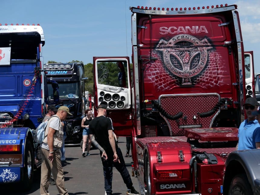 Un souvenir du GP du Castellet, les 27 et 28 mai derniers. Sur le parking, ils étaient côté à côte : à ma gauche, le Scania S 650 de la compagnie Autotrasporti La Petilina et ses huit enceintes par portière, conduit par Carlo Liotti… à ma droite, l’Iveco 190 Turbostar 1992 de Domenico Scalise, qui n’en comptait pas moins.