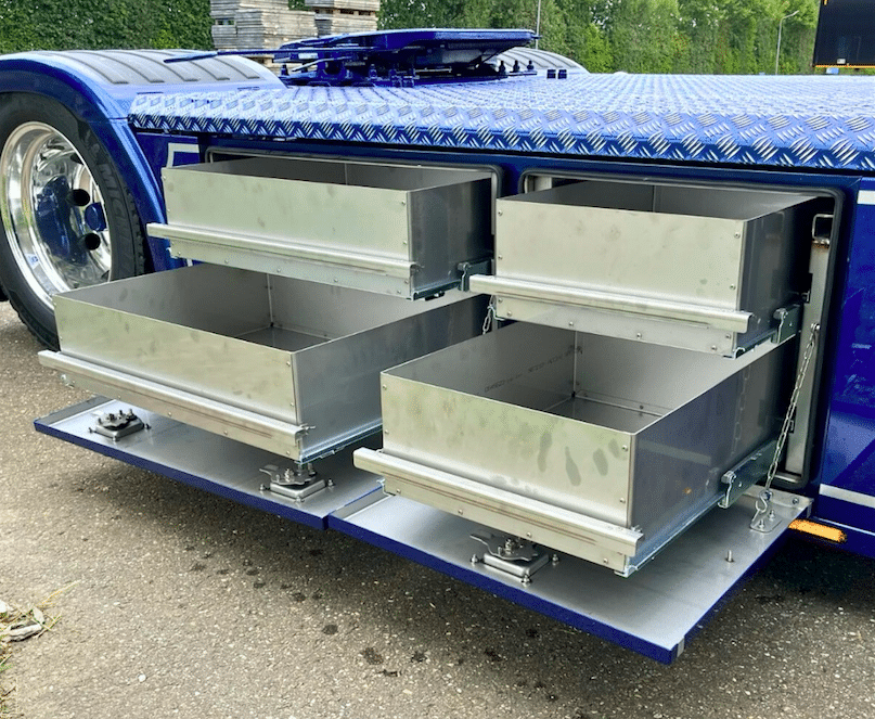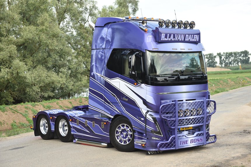 Une réalisation du carrossier hollandais Elenbaas pour le transporteur Handelsonderneming Dirk qui comprend aussi la peinture complète du véhicule, la pose de carénages en acier