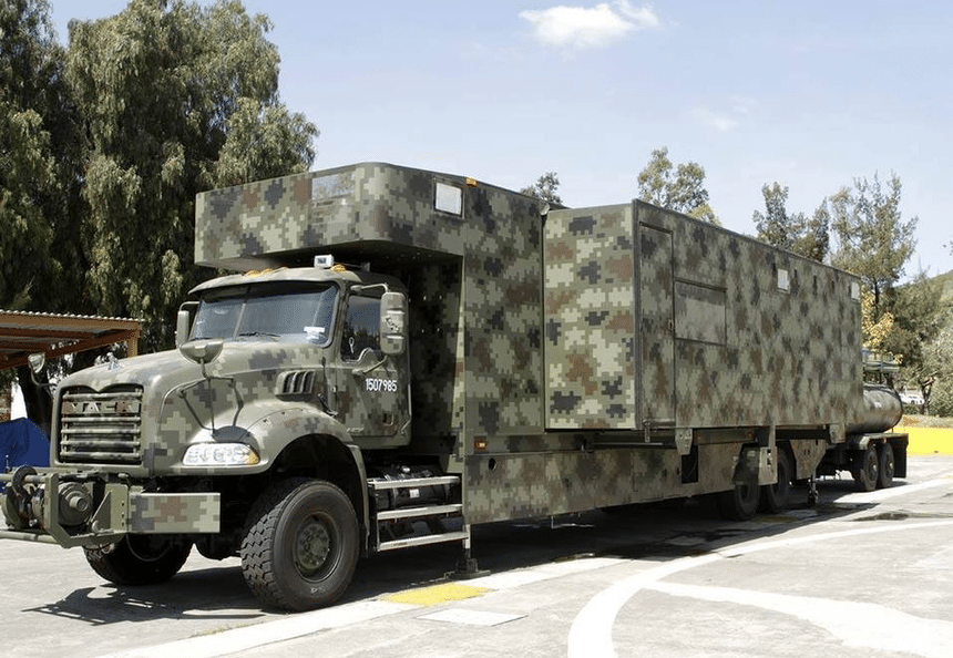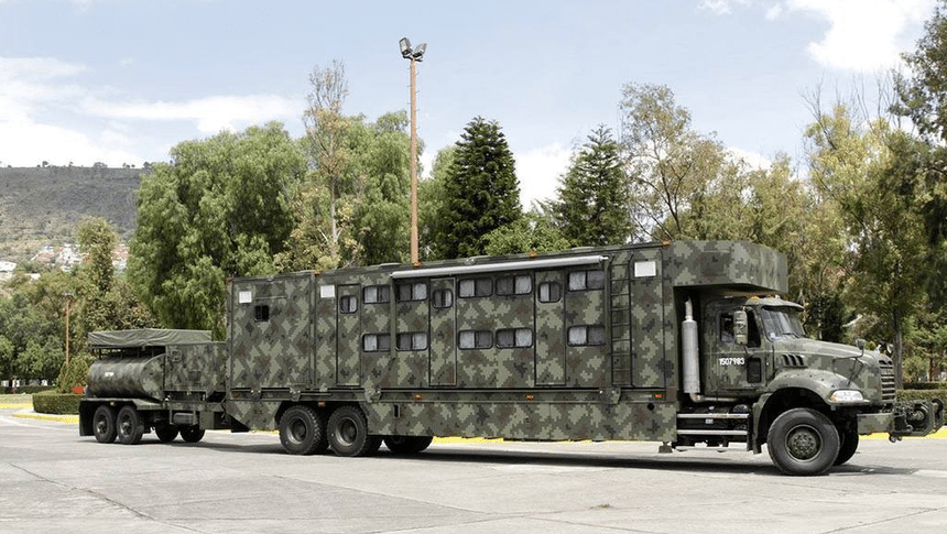 Deux camions, ce n’est pas le marché du siècle. Mais tout de même, ces véhicules, commandés par l’armée mexicaine, n’ont rien de banal. Leur châssis déjà, des Mack CT 6×6 à l’empattement démesurément long. Un choix qui n’est favorable ni à la maniabilité (on les imagine mal sur les routes de la Sierra Madre), ni aux évolutions sur sols non préparés, mais imposé par leur encombrant équipement. Carrossés au Mexique, par la filiale d’une société américaine, ils sont appelés « Unité tactique à usage multiple » et doivent être utilisés comme centre de commandement mobile, avec une capacité de fonctionnement de 14 jours en autarcie complète (eau, électricité, communications, climatisation, repas, repos, toilettes, etc.).