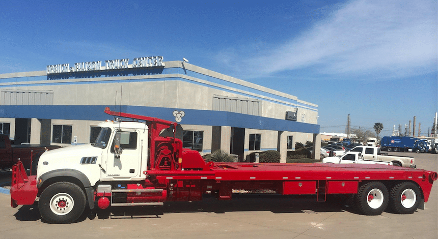 Deux remorques citernes complètent la dotation. L’une embarque 6 600 l de gazole, l’autre 8 500 l d’eau potable. Si l’empattement vous paraît excessivement long, rassurez-vous, il l’est vraiment. Cependant, ce n’est pas une première chez Mack. Car il est un autre secteur d’activité qui requiert des châssis de très grande longueur, celui de la prospection et de l’exploitation pétrolière. Les bed trucks américains doivent ainsi porter sur d’immenses plateaux des équipements lourds et encombrants, généralement chargés au treuil. Kenworth règnent en maître sur ce marché, mais Mack s’y glisse parfois avec des modèles issus de sa gamme Granite. Comme ce GU713 6×4, travaillant au Texas, dont l’empattement atteint 11 m. C’est beaucoup. Quant à la capacité de charge, elle est confortable, sans être excessive, avec un essieu de 10,4 t à l’avant et un tandem de 29,5 t à l’arrière. Encore, n’est-ce là, pour les pétroliers, qu’un modèle d’entrée de gamme…