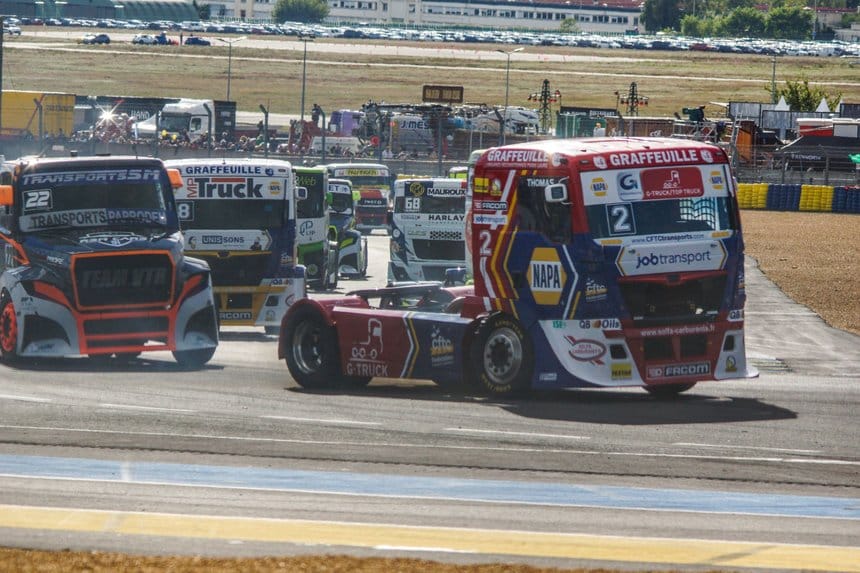 Dans la Sarthe, Téo Calvet (Freightliner Buggyra #20) s’est succédé à lui-même. Pour la deuxième année consécutive, le champion de France et leader du classement provisoire remporte les 24H Camions. Comme souvent, la lutte avec Thomas Robineau (MAN #2) nous a tenu en haleine tout le week-end. Les deux hommes se sont rendus coup pour coup, mais le pilote Freightliner a eu le dernier mot avec en point d’orgue la victoire dans la prestigieuse course de nuit.