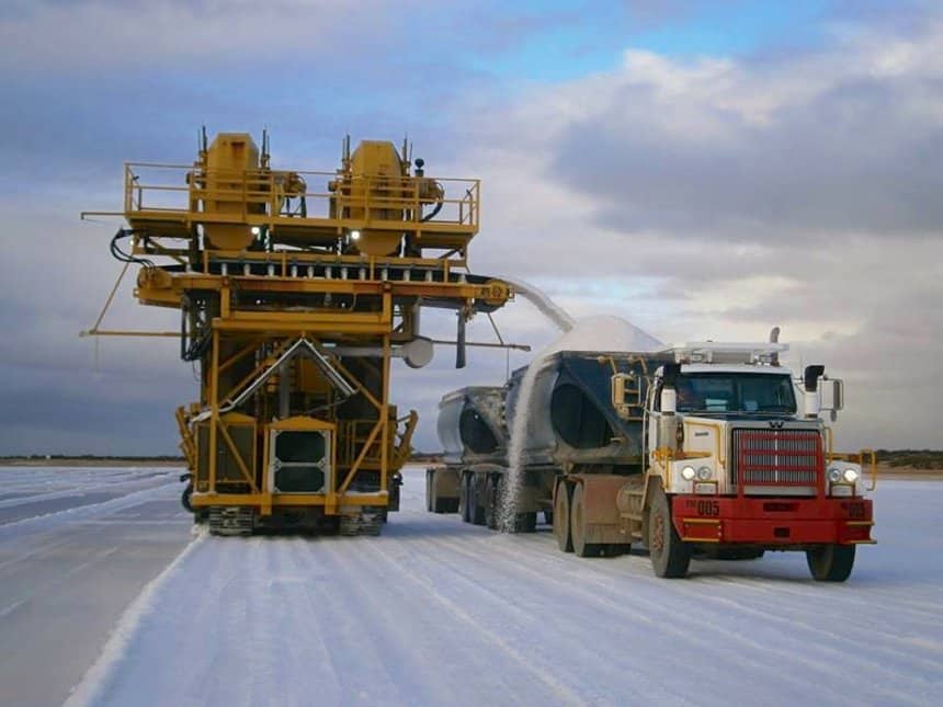 Du sel ! Il s’agissait de sel australien, récolté mécaniquement et acheminé par des trains doubles carrossés en benne à déversement par le fond. Pas moins de 160 t sont ainsi embarquées à chaque voyage.