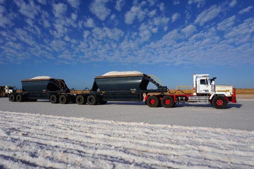 Du sel ! Il s’agissait de sel australien, récolté mécaniquement et acheminé par des trains doubles carrossés en benne à déversement par le fond. Pas moins de 160 t sont ainsi embarquées à chaque voyage.