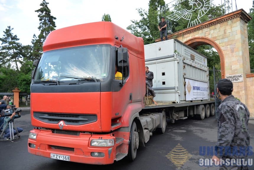 La scène se déroule en Arménie où ce Renault Premium, immatriculé à Erevan, sort précautionneusement une semi portant un conteneur dont l’apparence, pas vraiment conventionnelle, laisse entrevoir un chargement inhabituel.