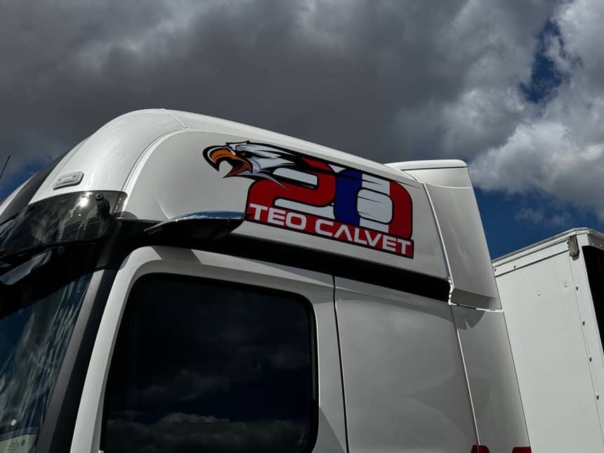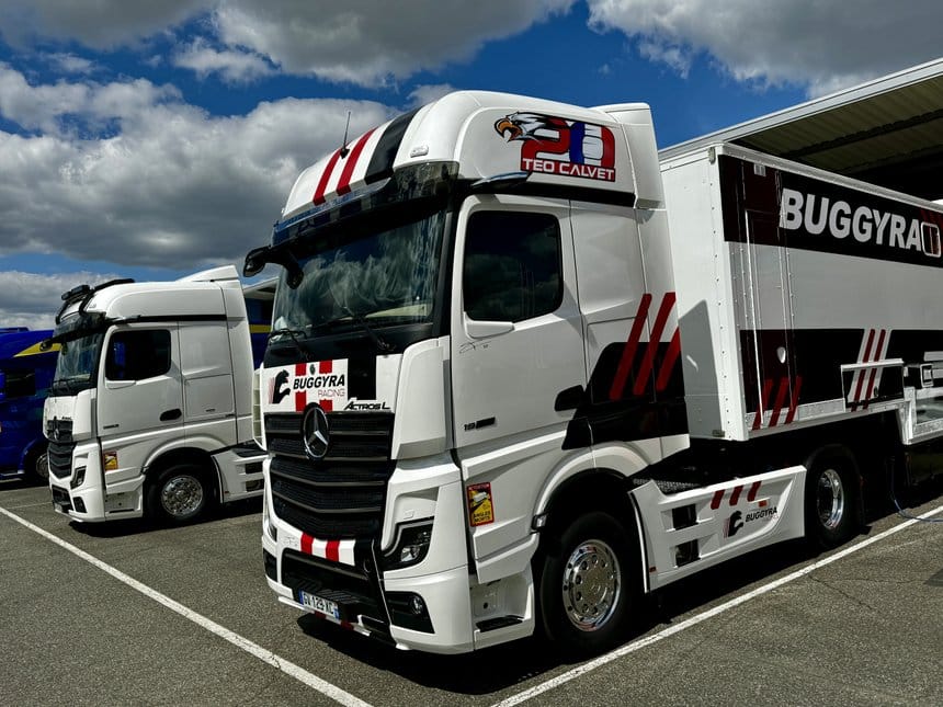 Un Freightliner sur-mesure chez Buggyra. Cette saison encore, Téo Calvet s’aligne en compétition au volant d’un Freightliner préparé par Buggyra. La marque améircaine appartient au groupe Daimler Truck, ce qui explique le partenariat.
