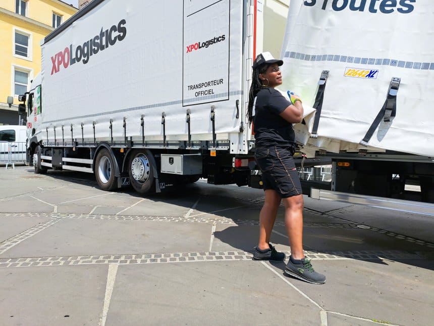 Sous le soleil de Clermont-Ferrand, les dernières coureuses cyclistes du Tour sont parties, la place de Jaude se vide. Le ballet des camions commence. Natacha conductrice chez XPO depuis deux ans débâche sa semi pour la charger. Objectif, faire place nette au plus vite. Natacha travaille depuis plus de douze ans dans le transport. Pour évoluer, elle a changé d’employeur. « J’ai eu beaucoup de refus, c’est XPO qui m’a embauchée ».