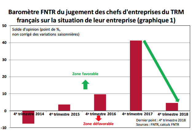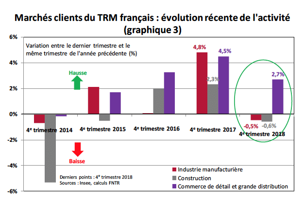 - Au 4e trimestre 2018, les chefs d’entreprises du TRM notent une nette baisse de leur activité engendrée, notamment, par l’évolution de leurs grands secteurs clients.