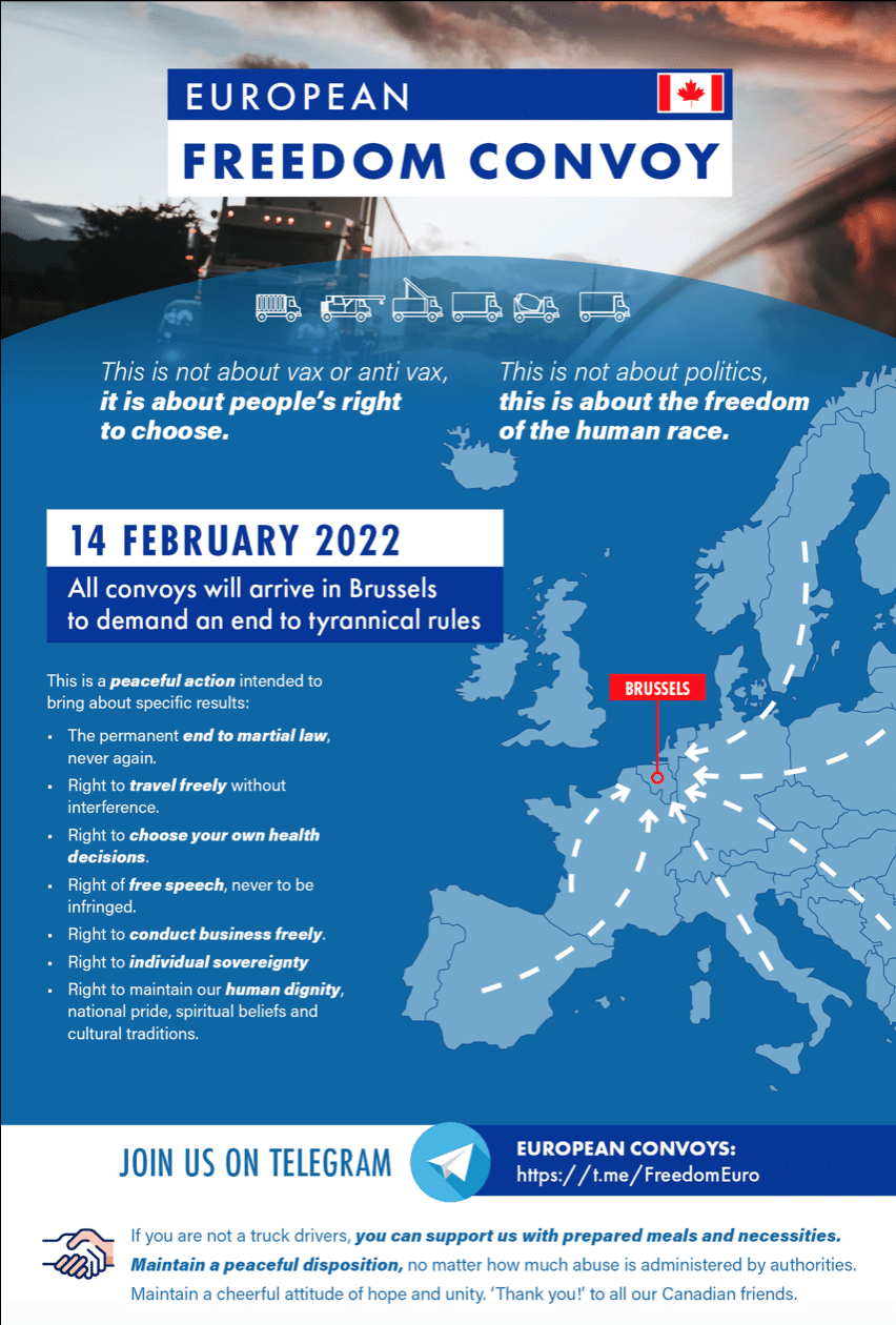 À l’image de ce qu’il s’est passé au Canada, plusieurs convois s’organisent en Autriche, en Finlande, en Espagne, au Portugal, en Suisse, en Grèce, en Belgique, aux Pays-Bas, ou encore en Pologne avec comme objectif de rallier Bruxelles le 14 février pour porter leurs revendications à la Commission et au Parlement européen.