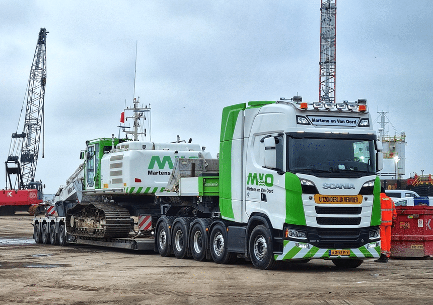L’entreprise de travaux publics néerlandaise Martens en Van Oord a reçu, à la fin de l’année dernière, un nouveau tracteur lourd pour le déplacement de ses engins de construction. Il s’agit d’un Scania 660 S homologué au PTR maxi de 180 t qui présente la particularité d’avoir 5 essieux, dont 4 moteurs et 3 directeurs.