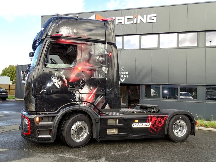 Tradition maintenue cette année pour Mercedes France, qui a préparé un camion en vue des 24H au Mans. Cette année, c’est logiquement un Actros L ProCabin sur lequel l’artisan du covering Facing a déposé son talent. Le thème est inspiré d’une grande lignée de films de science-fiction, suivez mon regard… La déco sur une base noire affiche des couleurs qui scintillent à la lumière. A bord, même topo, avec nombre d’accessoires impressionnants, du concept SoloStar à la sellerie cuir en passant par une cafetière ou les désormais traditionnelles tablettes tactiles compilant commandes et nécessaire à la bonne marche du véhicule.