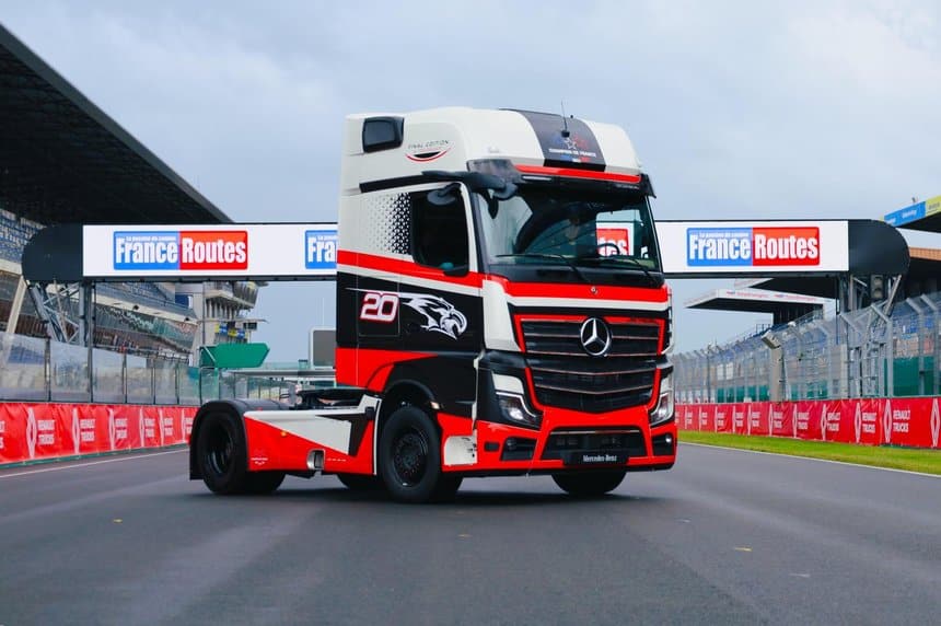 Les couleurs du champion. Le 20 est le numéro de course que Téo arbore sur son Freightliner préparé par le team Buggyra, une marque du groupe Daimler Truck. Le palmarès du jeune pilote toulousain, soutenu par Daimler Truck France, est déjà bien fourni avec deux titres de champion de France, mais qui a également des chances d’en remporter un troisième, puisqu’il est en tête à une course de la fin de la saison 2024.