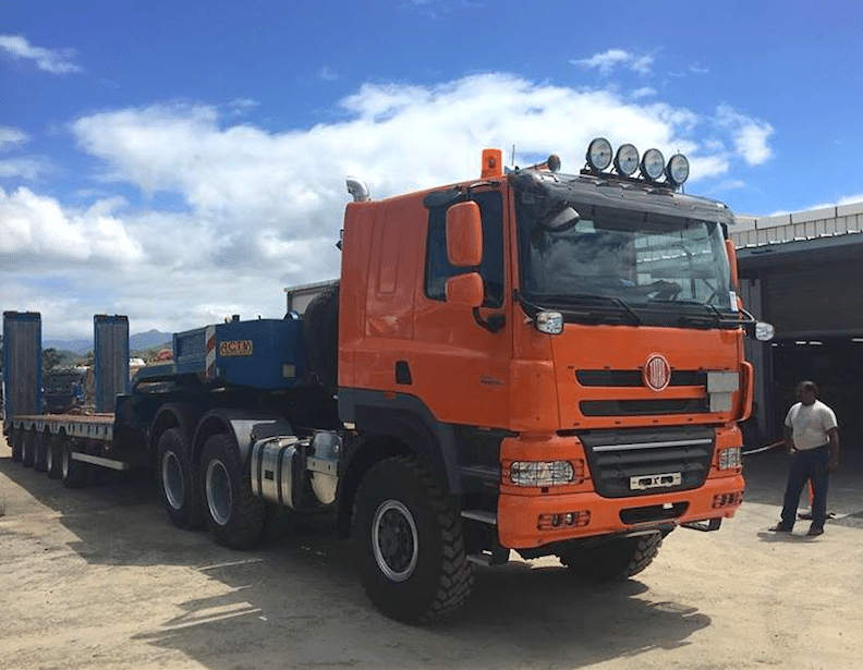 Deux choses encore, pour conclure. D’abord un impressionnant tracteur 6×6, doté d’une généreuse monte en pneumatiques et attelé à une robuste semi porte-engins ACTM. Sa particularité ? Il est français ! Mais il travaille à quelque 17 000 km de la métropole, en Nouvelle-Calédonie.