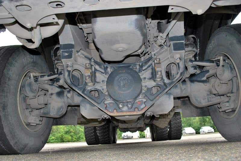 Enfin, un détail de ce qui fait la singularité des Tatra : un châssis poutre, toutes les roues motrices et une suspension à roues indépendantes avec éléments pneumatiques conférant un grand débattement.