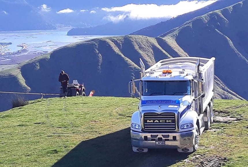 District de Marlborough, en Nouvelle-Zélande. Ce Mack Granite livre de l’engrais dans un paysage grandiose. Appréciée des touristes, cette région est aussi réputée pour ses vignobles et la qualité de ses vins blancs.