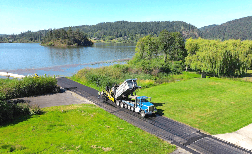 Dans ce paysage bucolique, un camion benne alimente en enrobés un finisseur. Nous sommes sur la côte Ouest des États-Unis, mais loin de la Californie, au nord-ouest de l’Oregon, près de l’État de Washington qui jouxte le Canada. Ce camion est un Peterbilt, un peu étrange pour nous, avec ses trois essieux additionnels dans l’empattement (relevables et auto-vireurs). Ce qui fait évidemment beaucoup de roues pour un PTAC légal de seulement 31 t – moins qu’un 8×4 français. Car dans l’Oregon on ne plaisante pas avec la surcharge et encore moins avec les limites de charge à l’essieu. En revanche, ce porteur est plutôt compact avec une longueur de 7,4 m mais un empattement de 6,55 m.