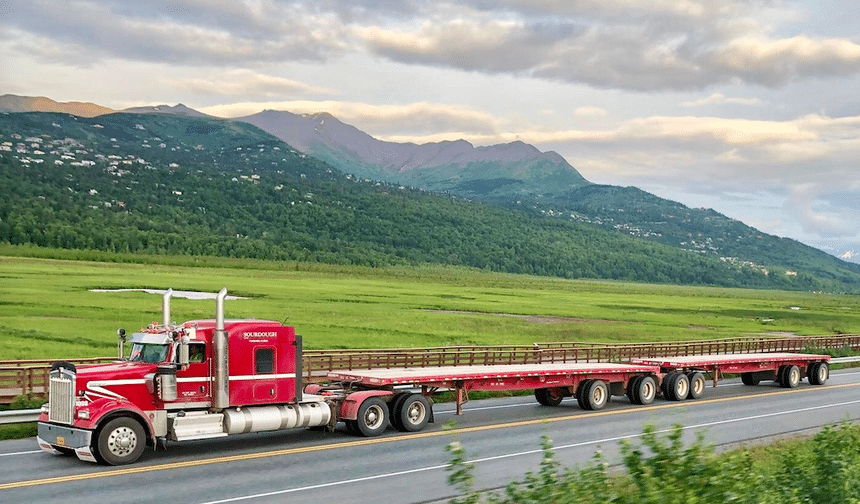 Et pour finir, un Kenworth W900L attelé à un train double, traçant sa route dans l’État le plus septentrional des États-Unis, l’Alaska.