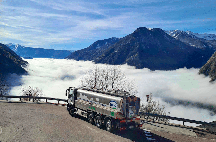 Avec, pour commencer, une vallée des Alpes italiennes noyée sous les nuages, que domine, au soleil, un Iveco 8×2 carrossé en citerne à lait. Une image qui n’est pas sans rappeler le fameux serpent de Maloja, dans les Grisons, en Suisse, où se déroule, par moment, une formation de nuages bas qui avance progressivement dans la vallée en laissant découverts les sommets.