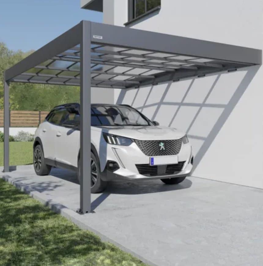 Ensuite, il importe de déterminer la structure du carport. Soit celle-ci sera adossée à un mur – auquel cas deux poteaux suffiront à soutenir le toit. Soit l’on opte pour un carport autoportant qui reposera au sol sur ses quatre poteaux. A cet égard, les carports en aluminium de Trigano Store proposent différentes configurations dont le carport double (pour deux véhicules) à quatre poteaux et adossement au mur.