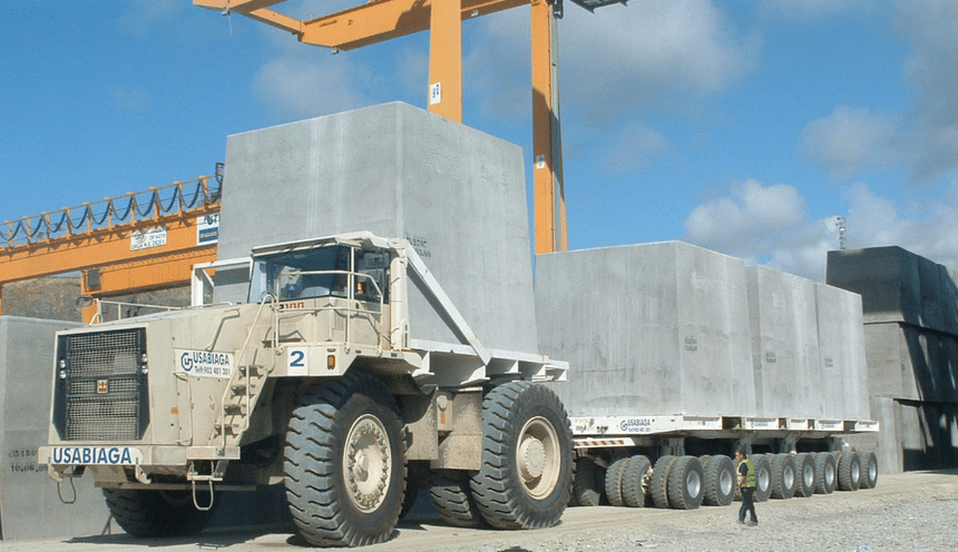 Pas vraiment un convoi routier, mais tout de même du transport lourd. L’Espagnol Usabiaga n’a pas hésité, il y a quelques années, à transformer un dumper Terex TR100, dont la benne a été déposée, en camion-remorqueur pour acheminer, sur site, de lourds blocs de béton. La remorque est une Trayl-Ona de fabrication espagnole.