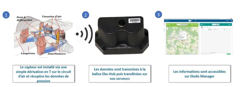 Ekolis s’appuie sur son expertise logicielle et matérielle en matière de suivi des remorques et de pression de pneumatiques, ainsi que sur les performances du logiciel web Ekolis manager, pour proposer un outil de mesure automatique à distance de la charge des véhicules au cours de leurs tournées.